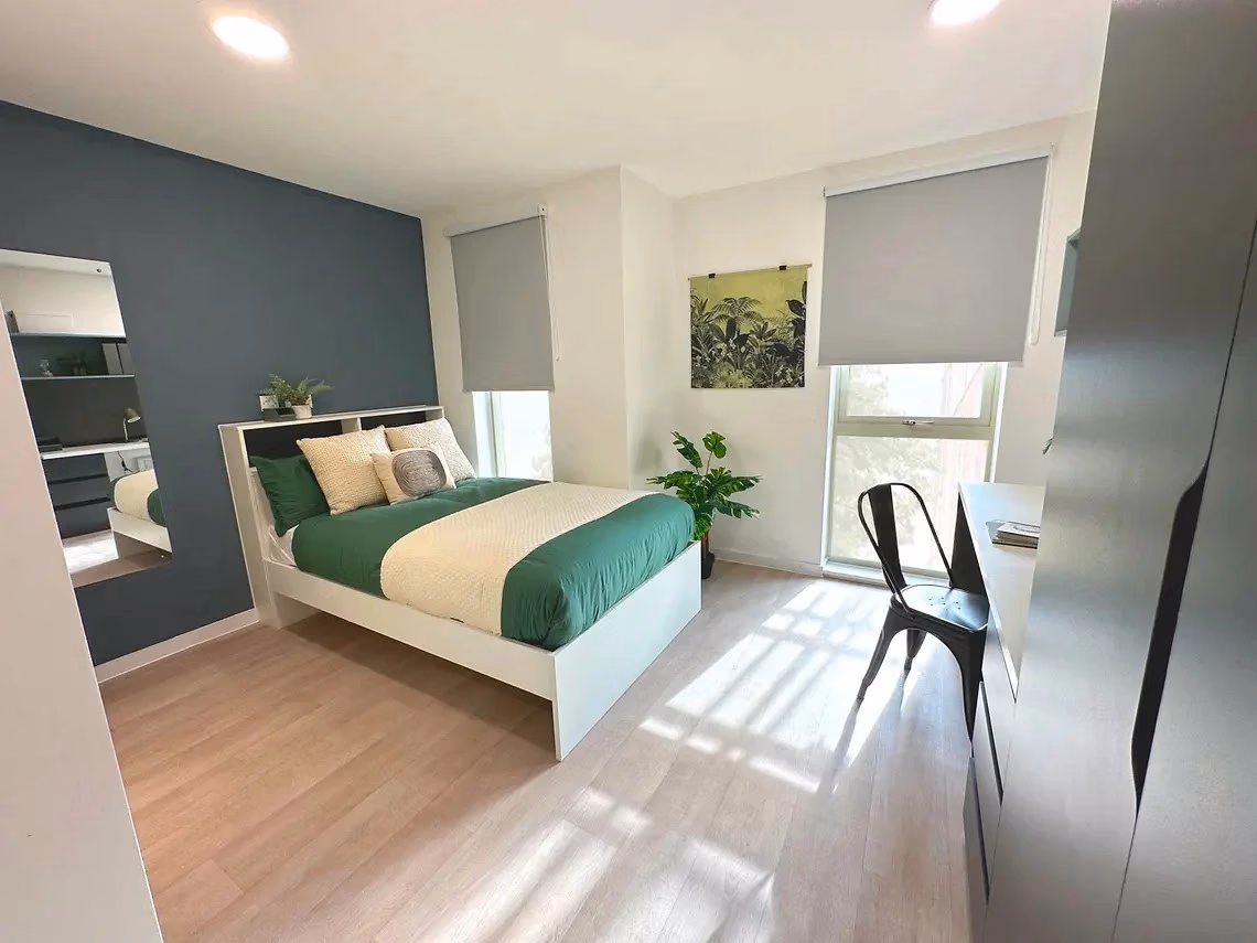 设施与配置可能有所不同;通常提供床、带书桌和椅子的学习区、书架、衣柜及充足储物空间。房间不含床上用品,因为多数学生喜欢自带,但您可通过他们的合作方UniKitOut提前订购床品和厨房用具,并在入住前送至房间。