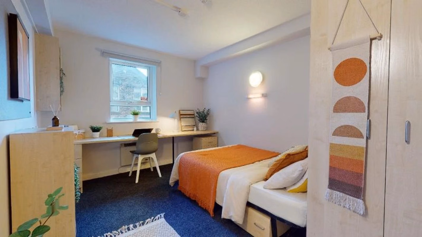 在Arkwright House Bradford,房型从Bronze En Suite到Bronze Studio一应俱全,满足不同预算与偏好。每套公寓均为学生生活精心设计:配有小型双人床,学习一天后可尽情放松;书桌与椅子助你专注学习;卧室还配有电视,让你在私密空间休闲。储物空间充足,配有衣柜、抽屉柜、书架、镜子及公告板,方便整理物品。共享厨房设施齐全,从冰箱与冷冻柜、电磁炉到微波炉、烤箱、餐桌椅及沙发一应俱全,方便与室友一起做饭聊天。