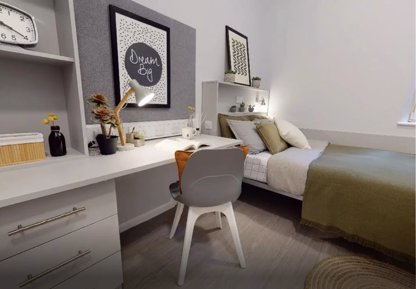 厨房配有烤箱、炉灶、微波炉、冰箱和冷柜,并设有用餐区和休息区。这类房型深受新生欢迎,便于与其他住户社交。单间公寓 – 他们的单间公寓为独立套房,配有集成厨房设施和起居区。所有房间均配有床、采光良好的学习区、储物空间以及带淋浴、洗手盆和马桶的独立卫浴。单间公寓适合追求更多私密空间的学生,同时仍可享用所有公共设施和社交区域。