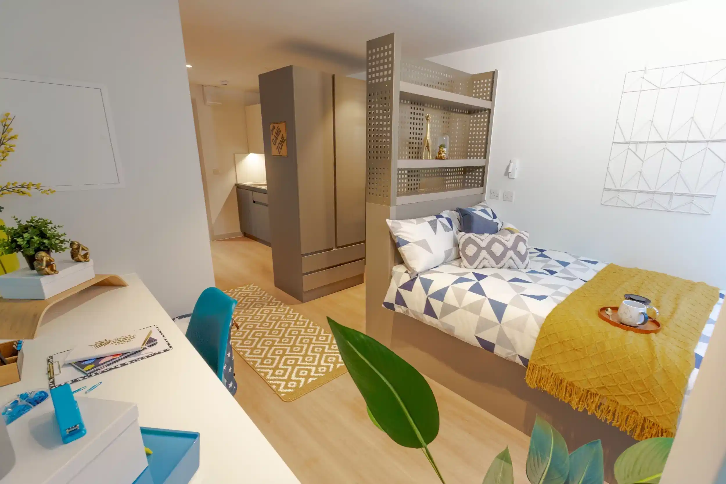 Market Quarter Studios学生公寓提供classic、deluxe、premium、superior studio等多种房型,配备齐全,提升你的学生居住体验。每间房间均配有学习书桌和椅子,为完成作业或备考提供理想空间。全公寓覆盖免费Wi-Fi和宽带,随时保持在线。双门衣柜和抽屉为你的物品提供充足储物空间,额外储物选项确保生活空间整洁。房间配有软木板,可展示个性并张贴重要提醒;衣帽钩方便收纳外套,USB插座让设备充电更轻松。