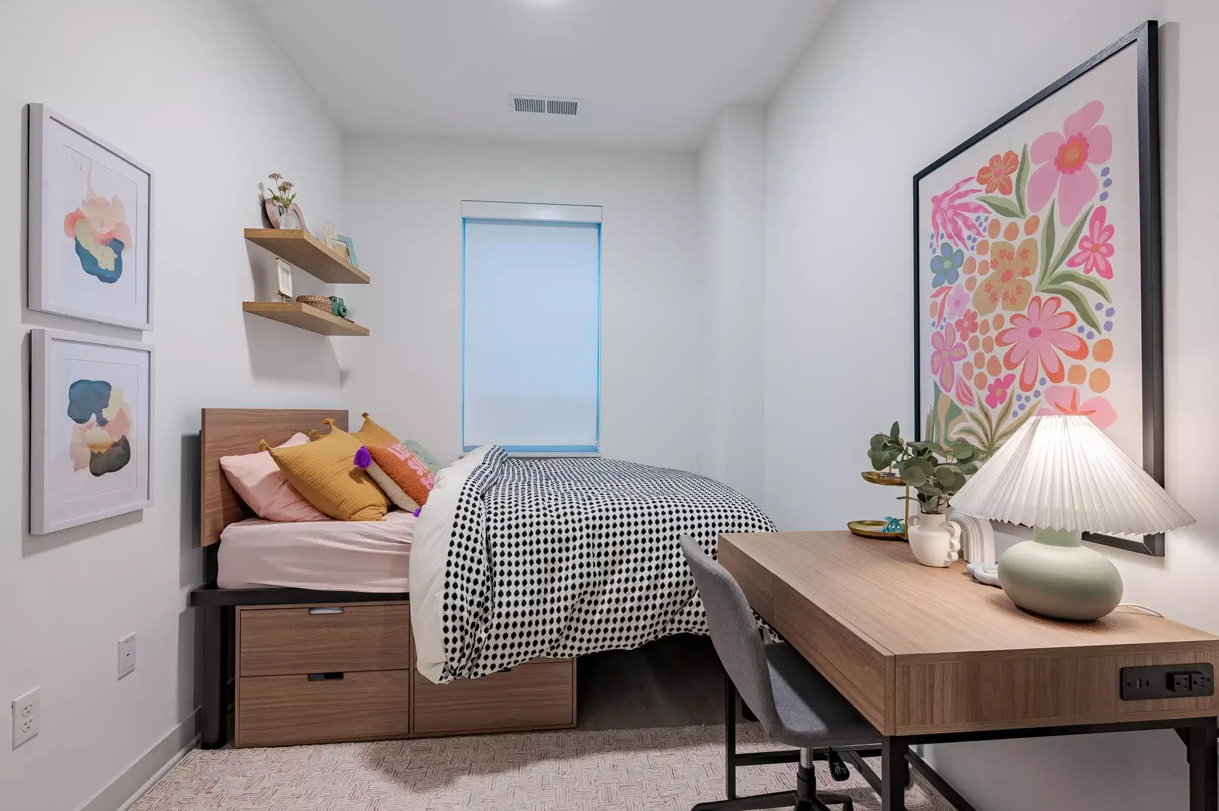 每位住户将拥有一张加大单人床,配有床头板和加厚床垫、一个四抽屉床下储物柜、一张带USB接口的书桌和一把书桌椅。